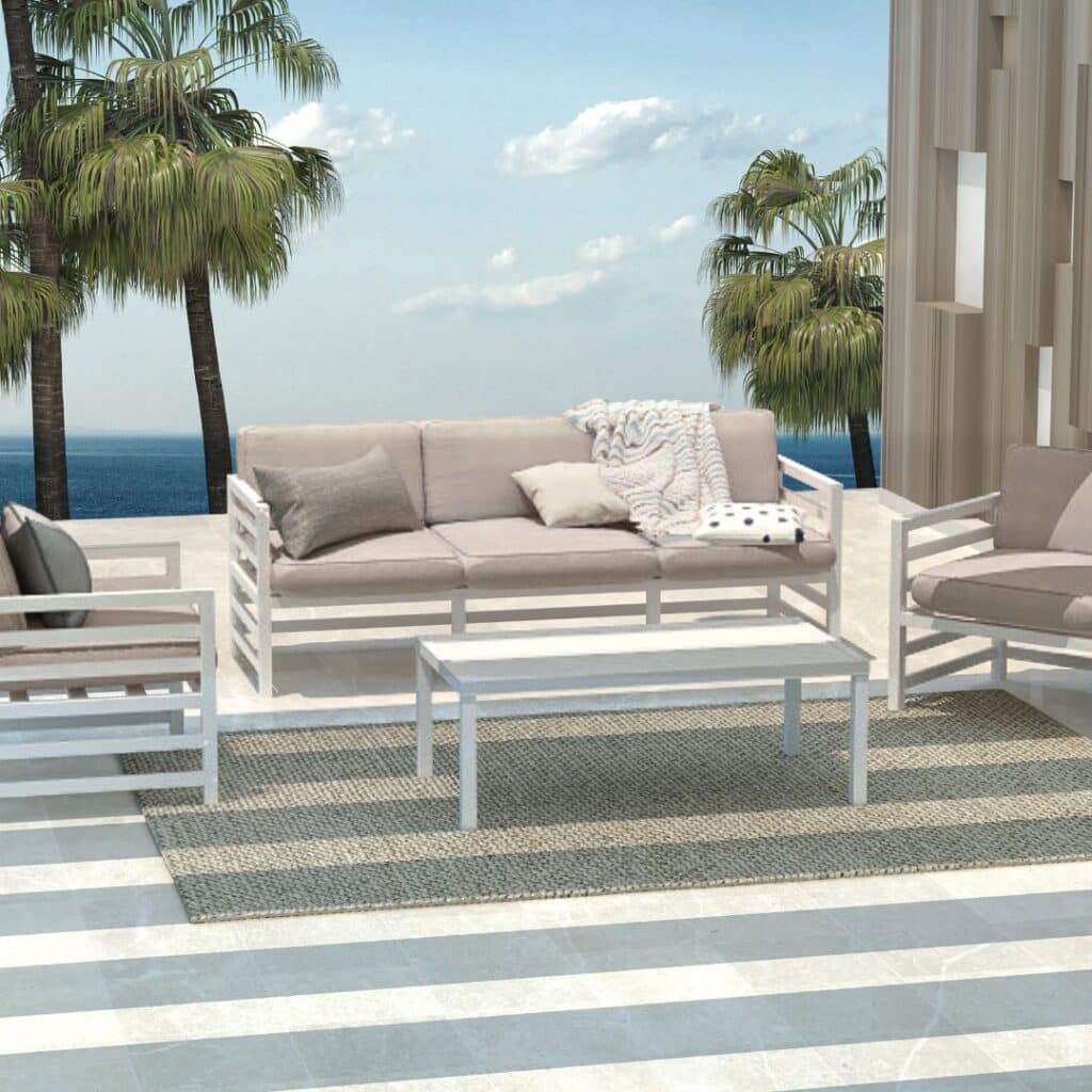 - Alfombras de exterior: Definen áreas y aportan calidez, mientras protegen el suelo de desgaste excesivo.