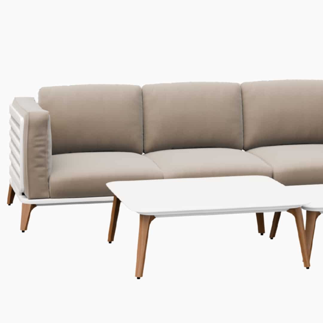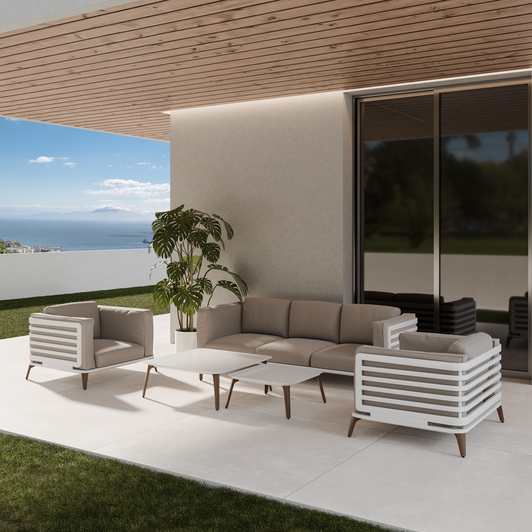 Conjunto de jardín exterior FERRARI en aluminio y madera sintética con sofá de 3 plazas, 2 sillones y mesa de centro. Diseño moderno, resistente a la intemperie y sin mantenimiento. Ideal para terrazas, porches y zonas chill out. ¡Disfruta del exterior con estilo y confort!