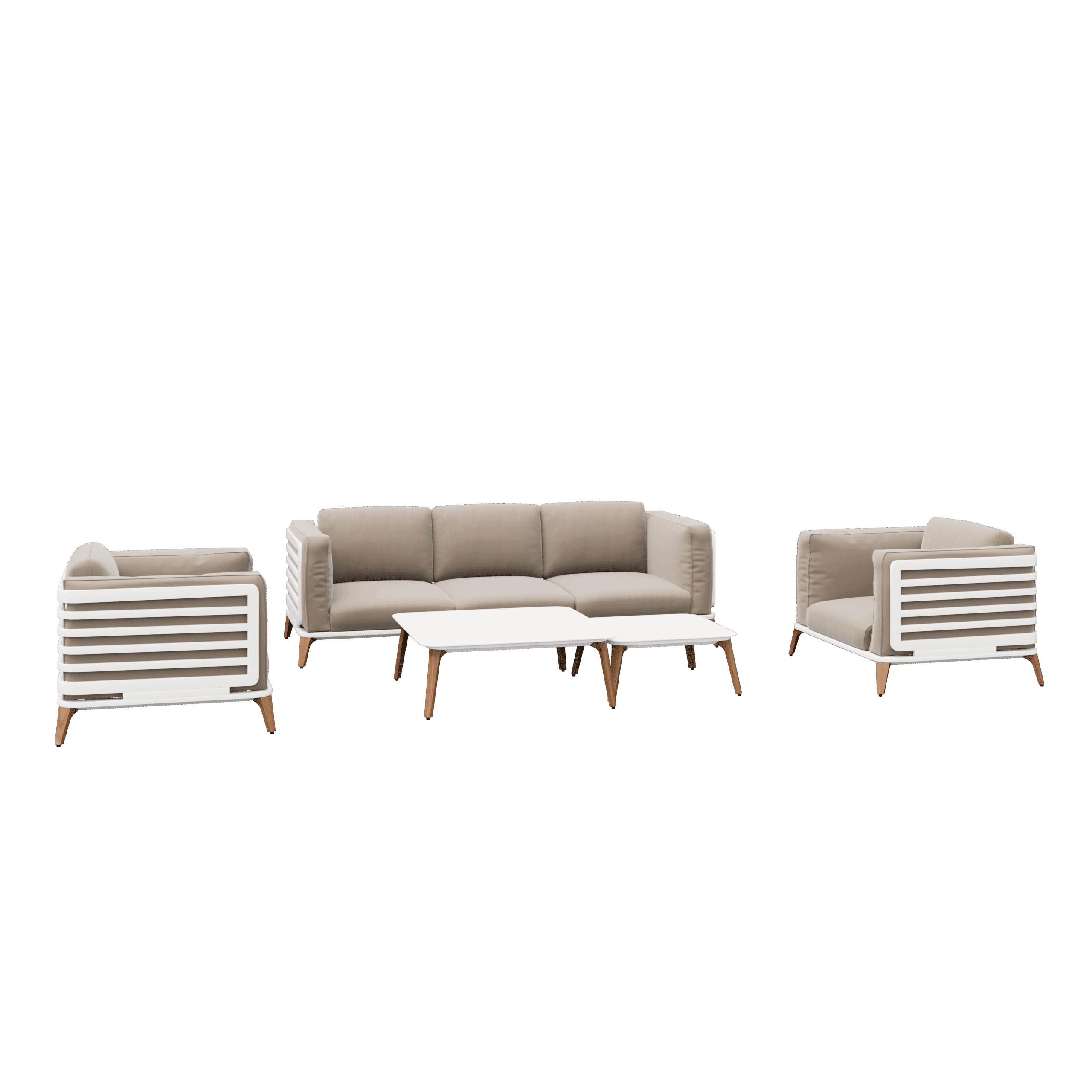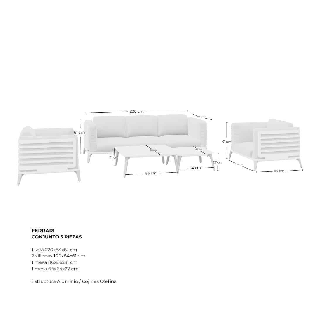 Disfruta del máximo confort al aire libre con el exclusivo conjunto de jardín exterior FERRARI, un set de diseño moderno y minimalista compuesto por 5 piezas. Su estructura de aluminio y los cojines de alta calidad en tejido Olefina lo convierten en una opción resistente, elegante y funcional para cualquier espacio exterior.