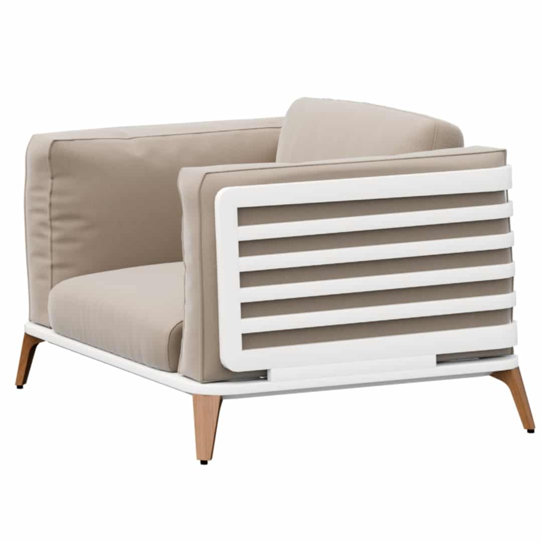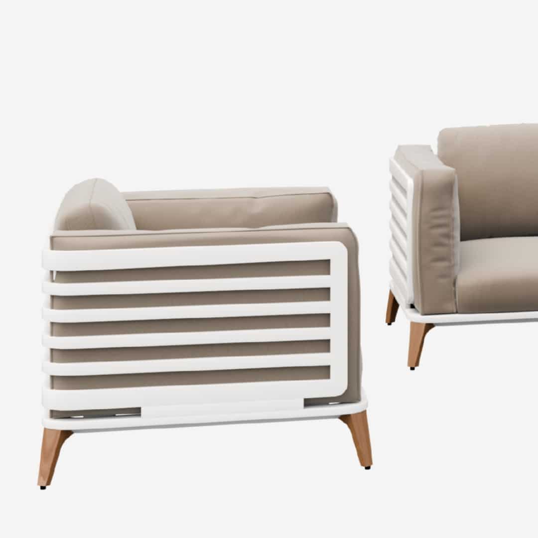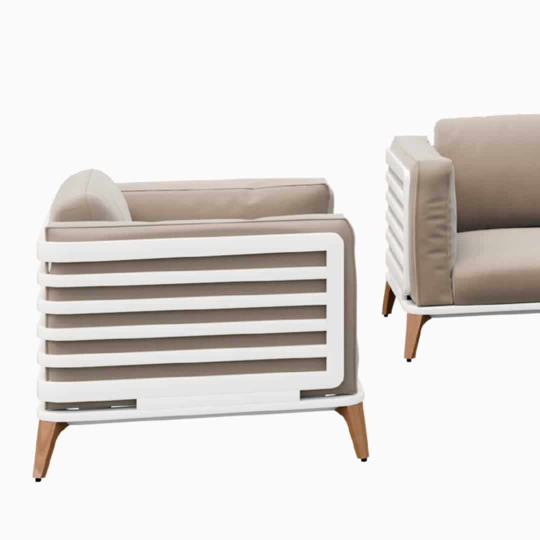 Cojines con tejido Olefina: Transpirable, de tacto suave y alta resistencia al sol y la humedad. Desenfundables y lavables para un mantenimiento sencillo.