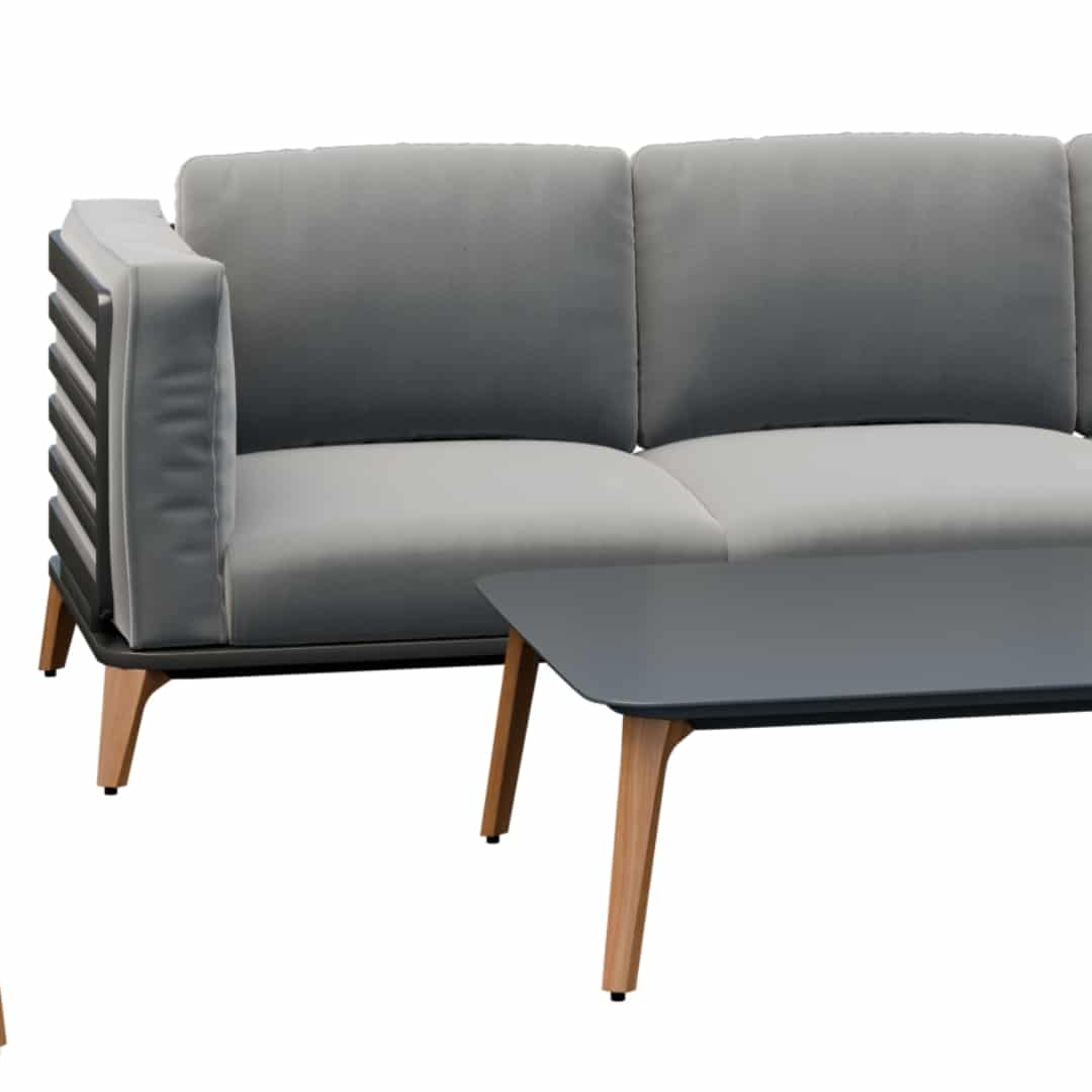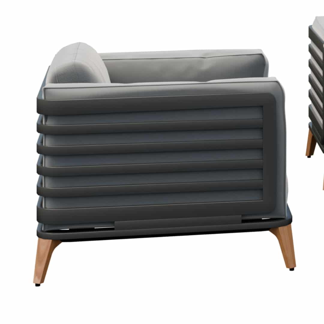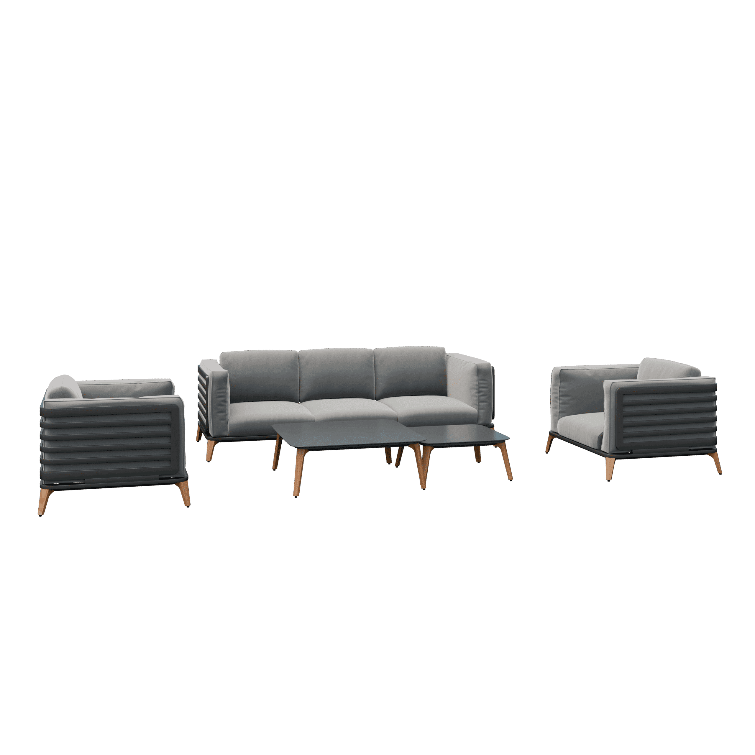 Conjunto de jardín exterior FERRARI en aluminio y madera sintética con sofá de 3 plazas, 2 sillones y mesa de centro. Diseño moderno, resistente a la intemperie y sin mantenimiento. Ideal para terrazas, porches y zonas chill out. ¡Disfruta del exterior con estilo y confort!