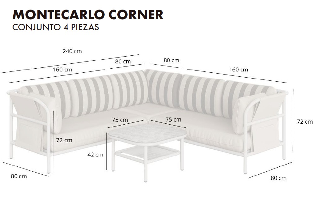 El conjunto MONTECARLO esquinero incluye 4 piezas con capacidad para 4 a 5 personas, ideal para terrazas y jardines. Su sofá esquinero y mesa cuadrada crean un ambiente acogedor y funcional, combinando estilo y practicidad.