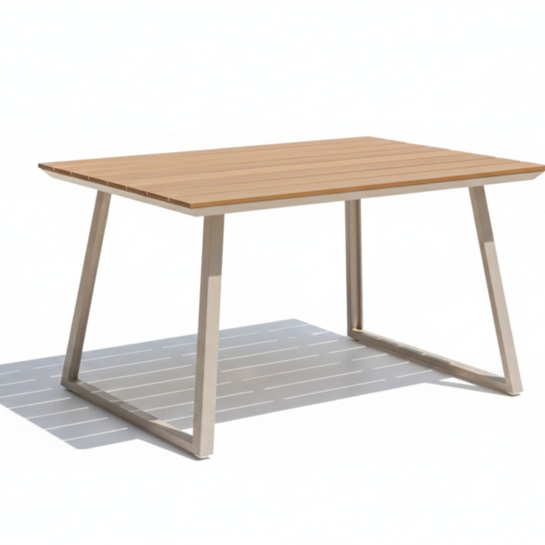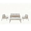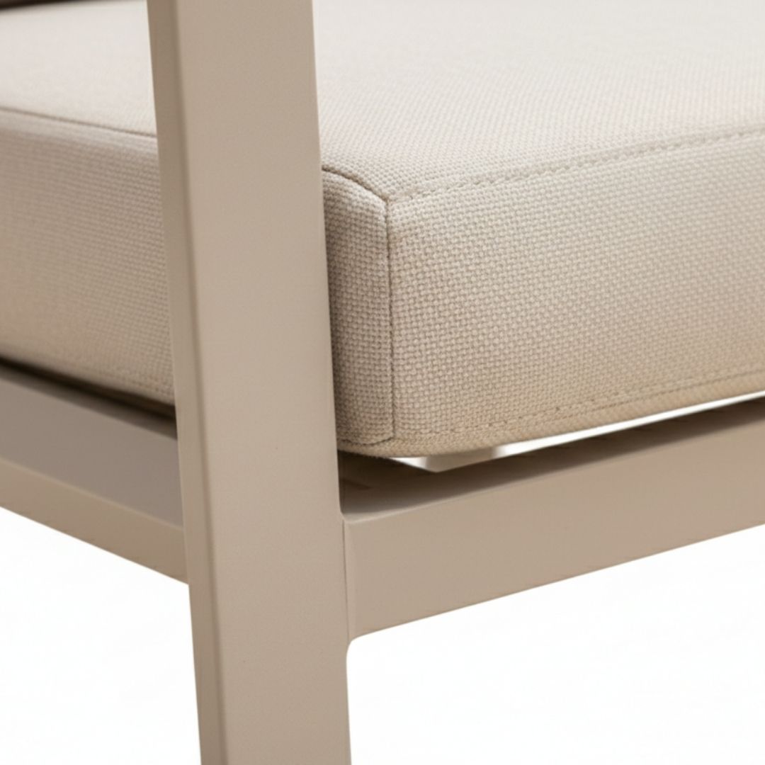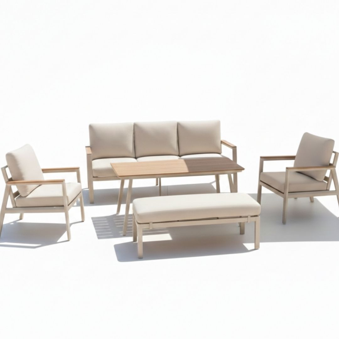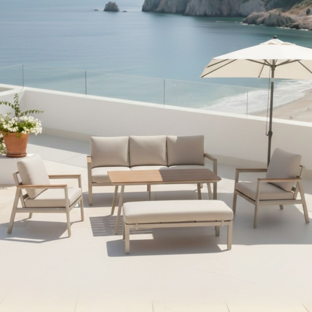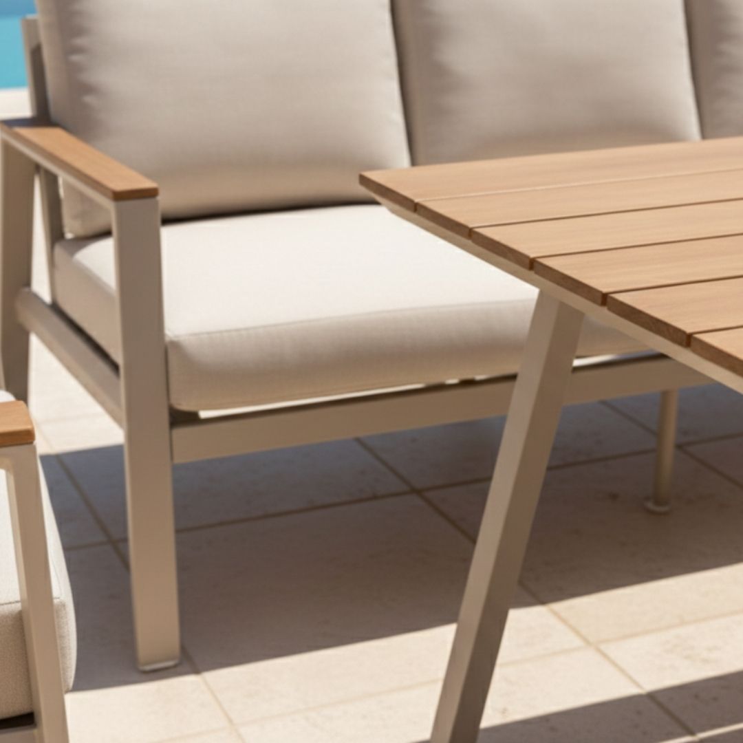 El conjunto de jardín Santorini destaca por su diseño moderno y elegante, ideal para terrazas, jardines o porches. Su estructura de aluminio con acabado beige y los reposabrazos con detalle en madera sintética aportan estilo y durabilidad