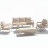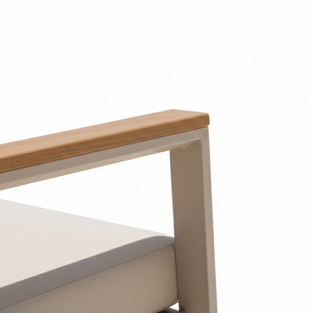 Conjunto de jardín SANTORINI , con estructura de aluminio acabado crema y madera en apoyabrazos.