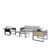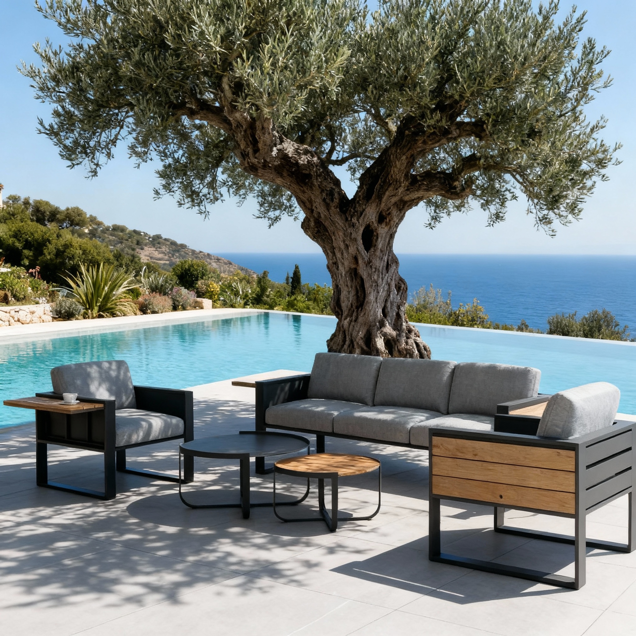 Conjunto de jardín MÓNACO de diseño elegante y funcional. Incluye sofá de tres plazas, dos sillones y dos mesas bajas fabricadas en aluminio con detalles en madera Teka. Cojines extra gruesos para máximo confort. Ideal para terrazas sofisticadas y espacios chill out.