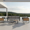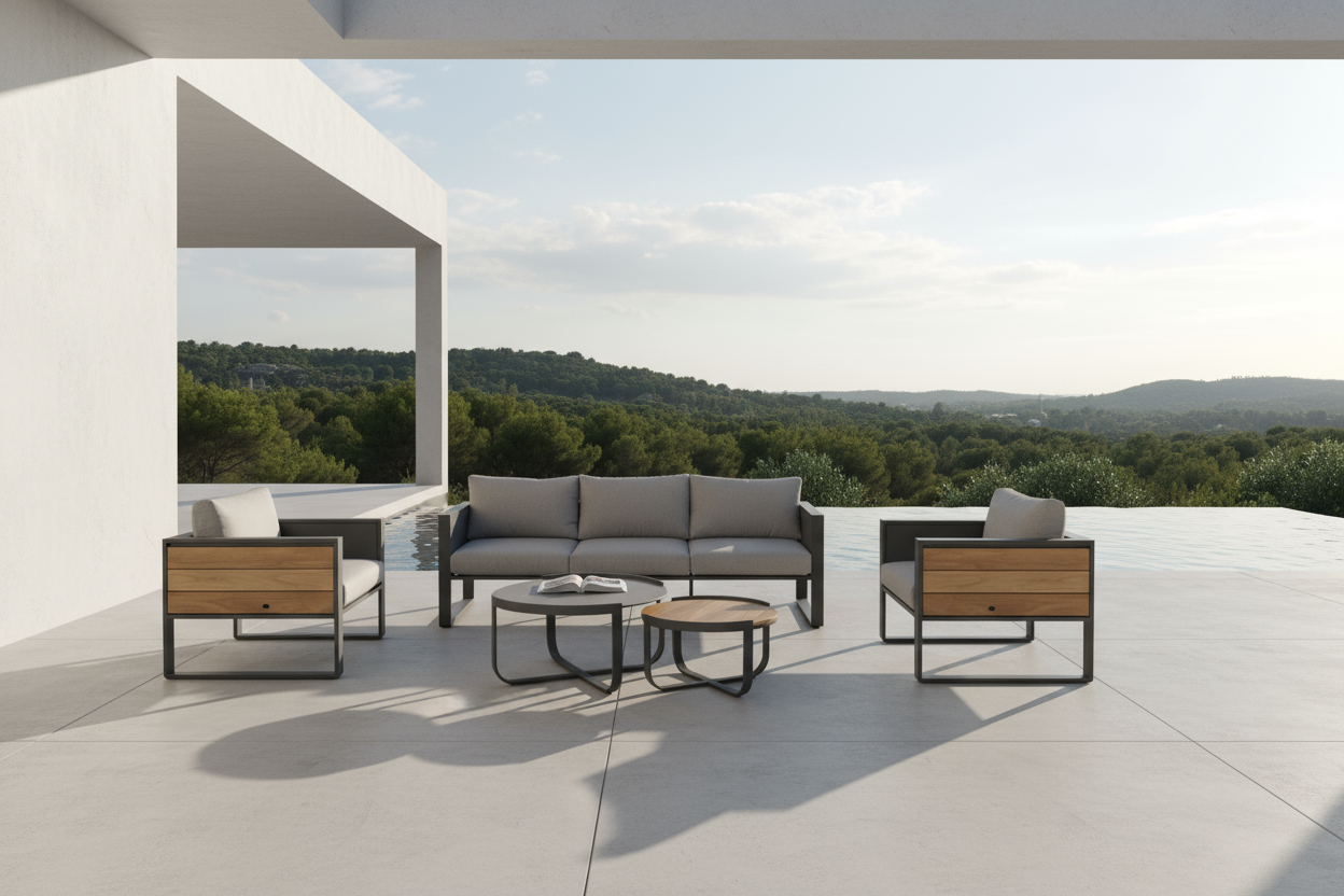 El sofá y los sillones están fabricados en aluminio con brazos laterales en acabado de madera Teka, que aportan calidez natural. Los brazos abatibles se transforman en mesas auxiliares para mayor versatilidad.