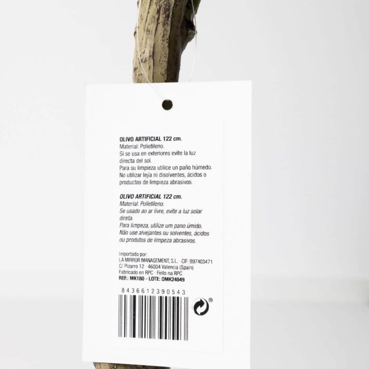 Materiales de Alta Calidad: Tronco robusto de polietileno y hojas de tela resistente que imitan la textura y el color del olivo real.