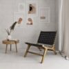 Silla Habana Marrón, fabricada en madera de teca maciza con asiento y respaldo trenzados a mano en cuero marrón, perfecta para cualquier espacio