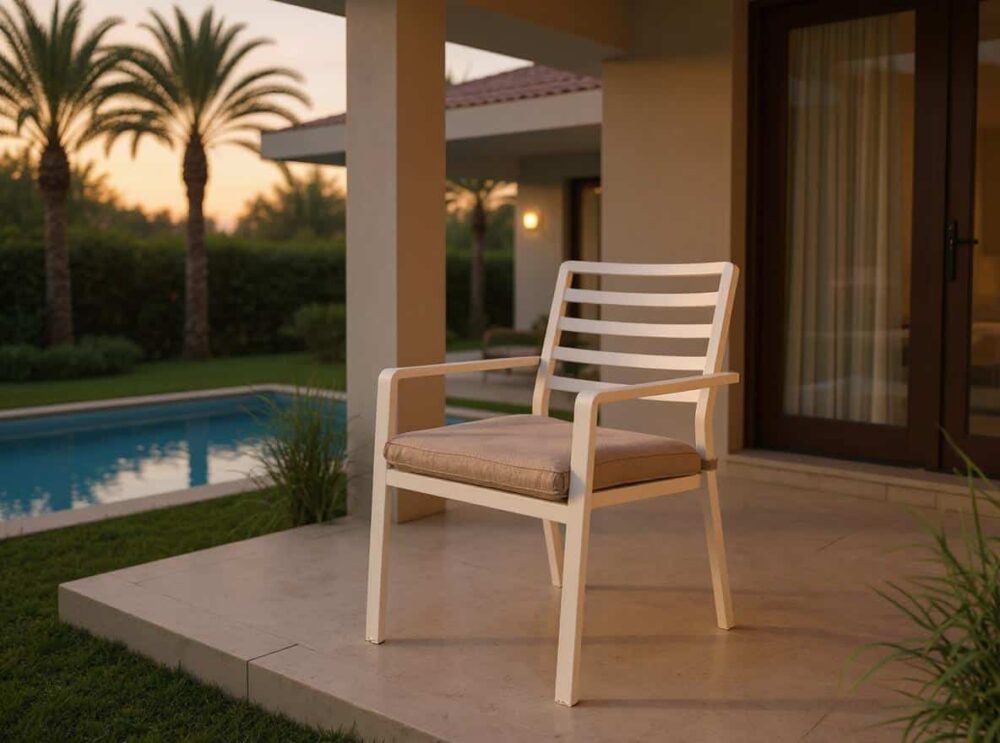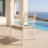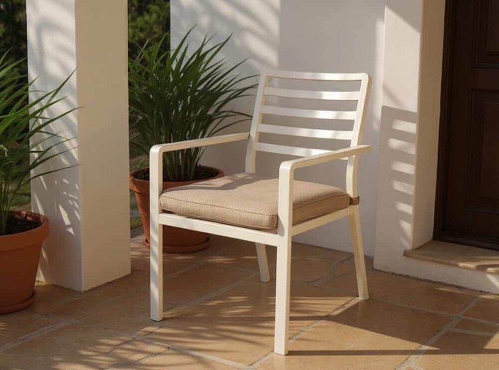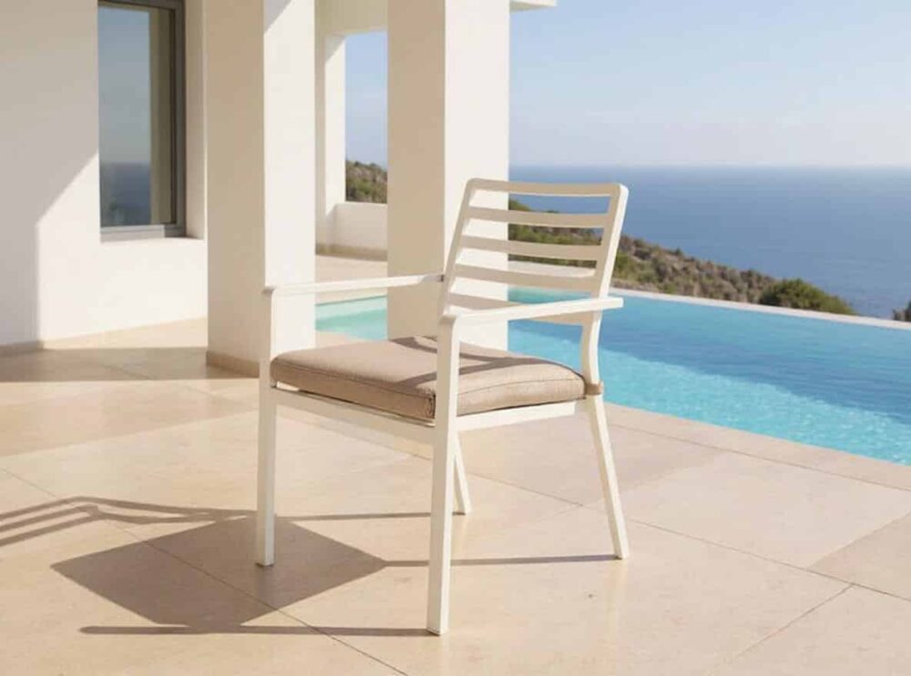 Silla Galilee, ideal para interior y exterior. De aluminio, pesa poco y no se oxida, además es apilable. Cojín impermeable de 5cm de grosor