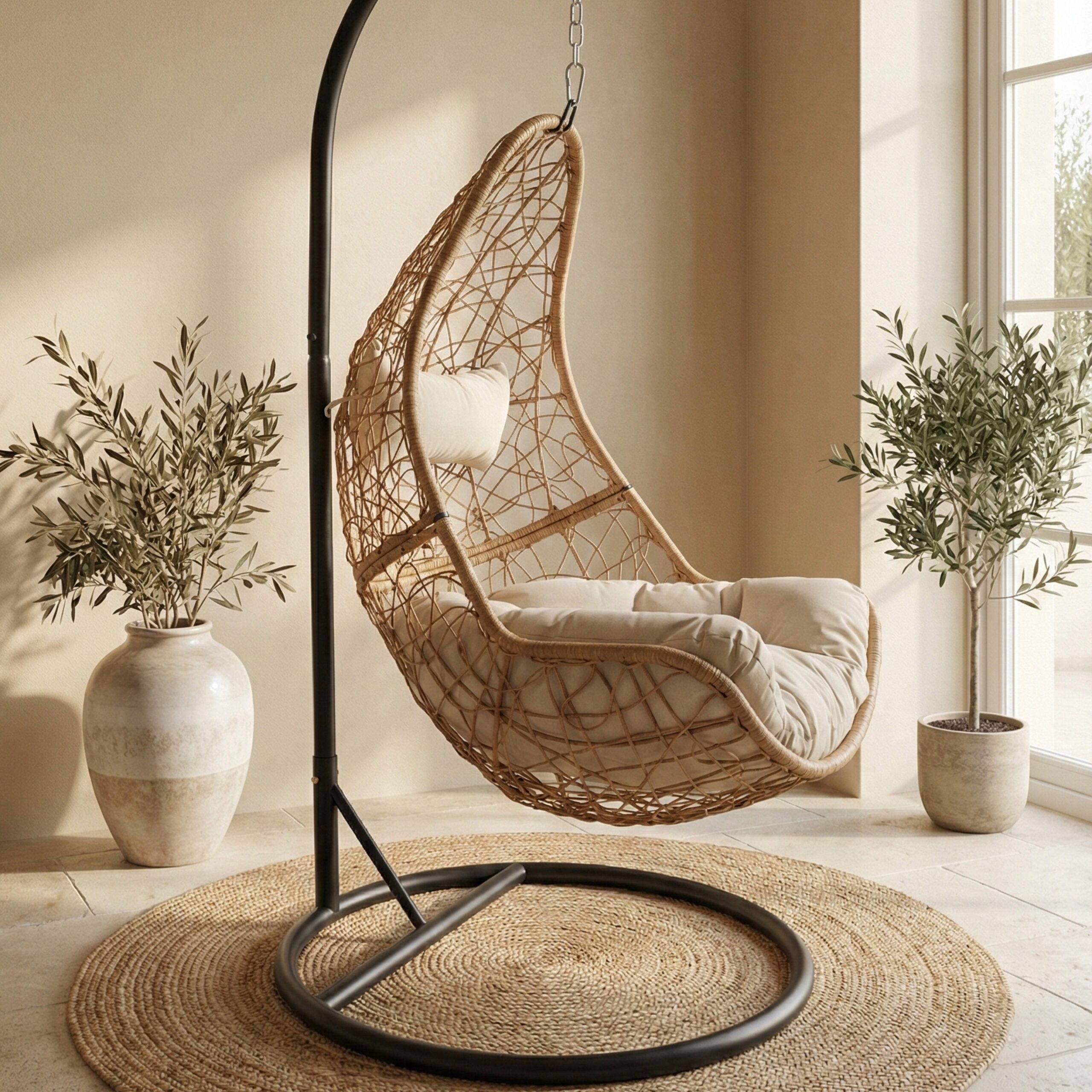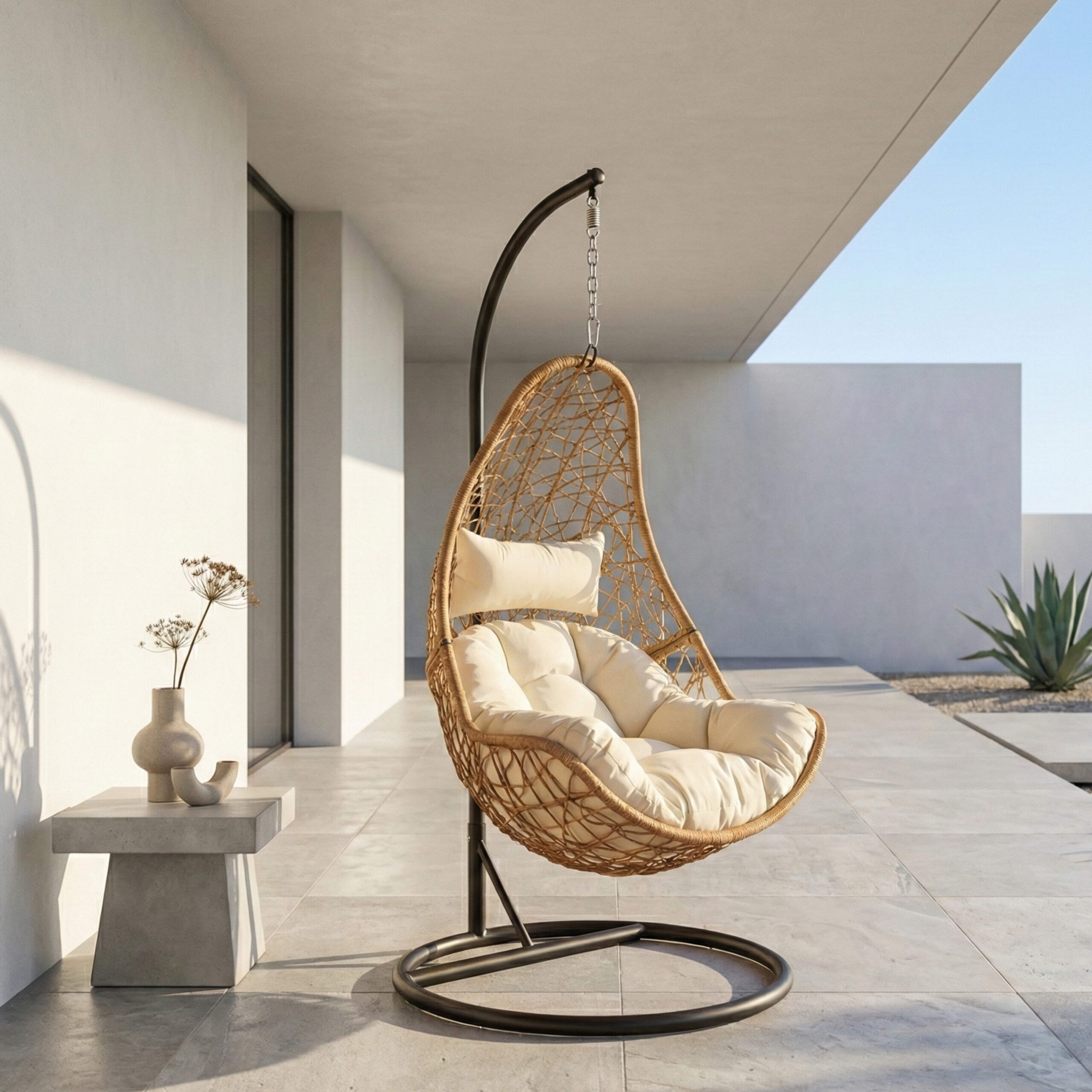 Gracias a su estructura sólida y a la comodidad de su asiento acolchado, este sillón colgante es ideal para crear un rincón de relax al aire libre. Su diseño ligero y elegante se integra perfectamente en terrazas modernas, jardines mediterráneos o espacios exteriores de estilo contemporáneo.